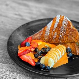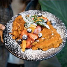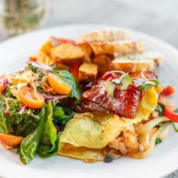Came here for brunch with a friend on a Sunday noon and didn't have to wait too long to be seated. The interior is small, but there's plenty of seating inside and the decor is very classy with the plants and greenery. It took a few tries to get someone to come take our order. I ordered the Fried Chicken and Pandan Waffle and Ice Butterfly Lychee Fizz. My friend got the Vegan Sandwich. Our food took a while to get to us (around 20 minutes). Fried Chicken and Pandan Waffle: 5/5, I really liked the apple mustard for my chicken, and the homemade syrup was great too. The chicken was crispy yet tender, and the waffle was nice and fluffy. Good portions! Ice Butterfly Lychee Fizz: 5/5, love the touch of the two lychee fruits as a topping. The drink was a beautiful purple color. Definitely a drink on the sweeter side. Vegan Sandwich: 2/5, it was fairly flavorless and didn't really come together as a "sandwich." The hash browns felt like they were heated up from frozen patties, and it felt like it needed a sauce or something to add moisture and flavor to it. The side fruit was good quality. Overall, had a good time catching up with my friend but would order other things on the menu instead of the Vegan Sandwich, which is unfortunate since there are only so many vegan things on the menu in the first place. I would be interested in trying more of the savory things on the menu next time like the Tom Yum Omelette!